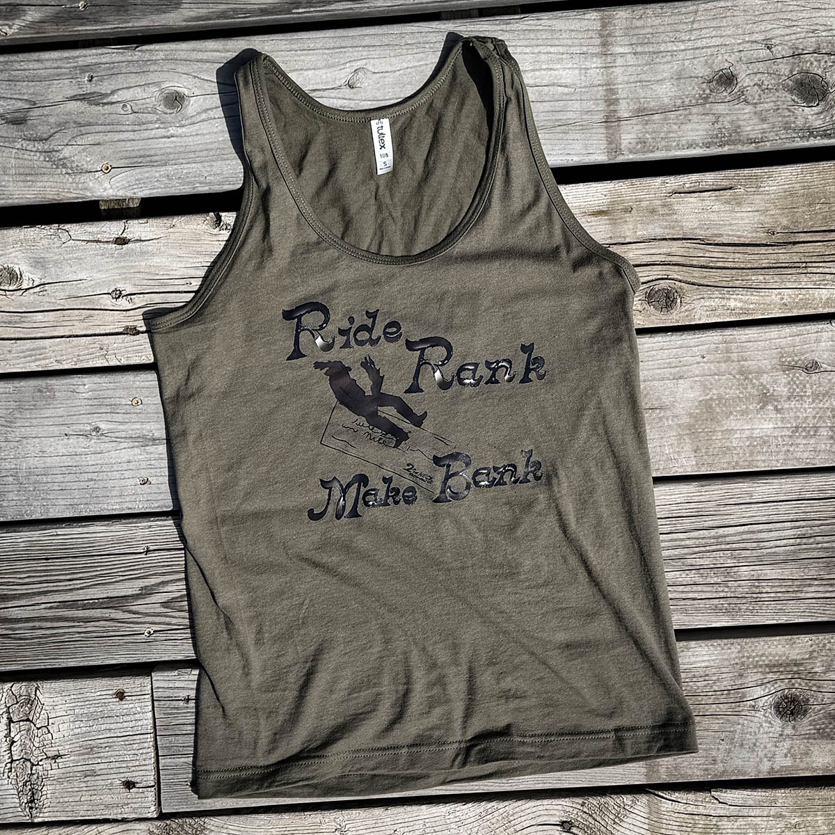 Ride Rank Make Bank on a Heathered Green or an Army Green Unisex Tank!